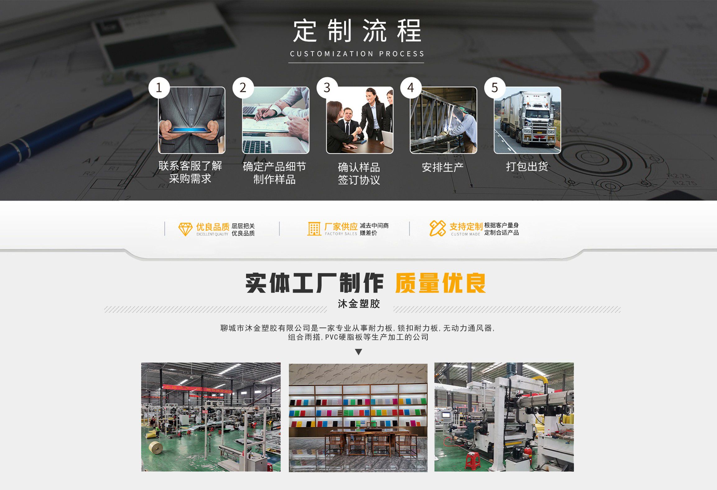 聊城市沐金塑膠有限公司注冊資金2180萬元,占地20000余平方,擁有自建廠房15000平方,員工100余名。10余年來,公司主營耐力板,鎖扣耐力板,耐力板深加工,無動力通風器,組合雨搭,PVC硬脂板,耐力板廠家等板材的發展戰略,逐漸成長為綜合性企業?! 」緭碛卸鄺l板材共擠生產線,采用世界知名品牌進口原材料和先進工藝,依據完善的ISO9001質量管理體系和ISO14001環境管理體系,為產品的卓越品質提供了強有力的保證。憑借過硬的創新能力和堅實的硬件基礎,贏創已成為國內領先的熱塑性板材生產商,產品被廣泛應用于建筑業、農業、工業、廣告業、安防行業及DIY領域。 公司始終致力于通過提供最優的板材應用解決方案,為客戶創造最高的價值;堅守創新、質量、靈活、服務和速度的核心價值觀;堅持“完美的產品需要完美服務的支持”的經營理念,努力實現成為世界領先的板材與解決方案供應商的夢想?! ≡谖磥恚緦⒘⒆憧蛻粜枨?,不斷改變和完善現有產品,拓展產品線和充分開發板材的應用領域,為客戶創造全方位的價值。同時更好地實現員工的價值,實現公司團隊的價值。我們將與您一起創贏未來! 企業使命:成為世界領先的板材與解決方案供應商。 公司愿景:通過提供最優的板材應用解決方案,為客戶創造最高的價值。 核心價值觀:質量...